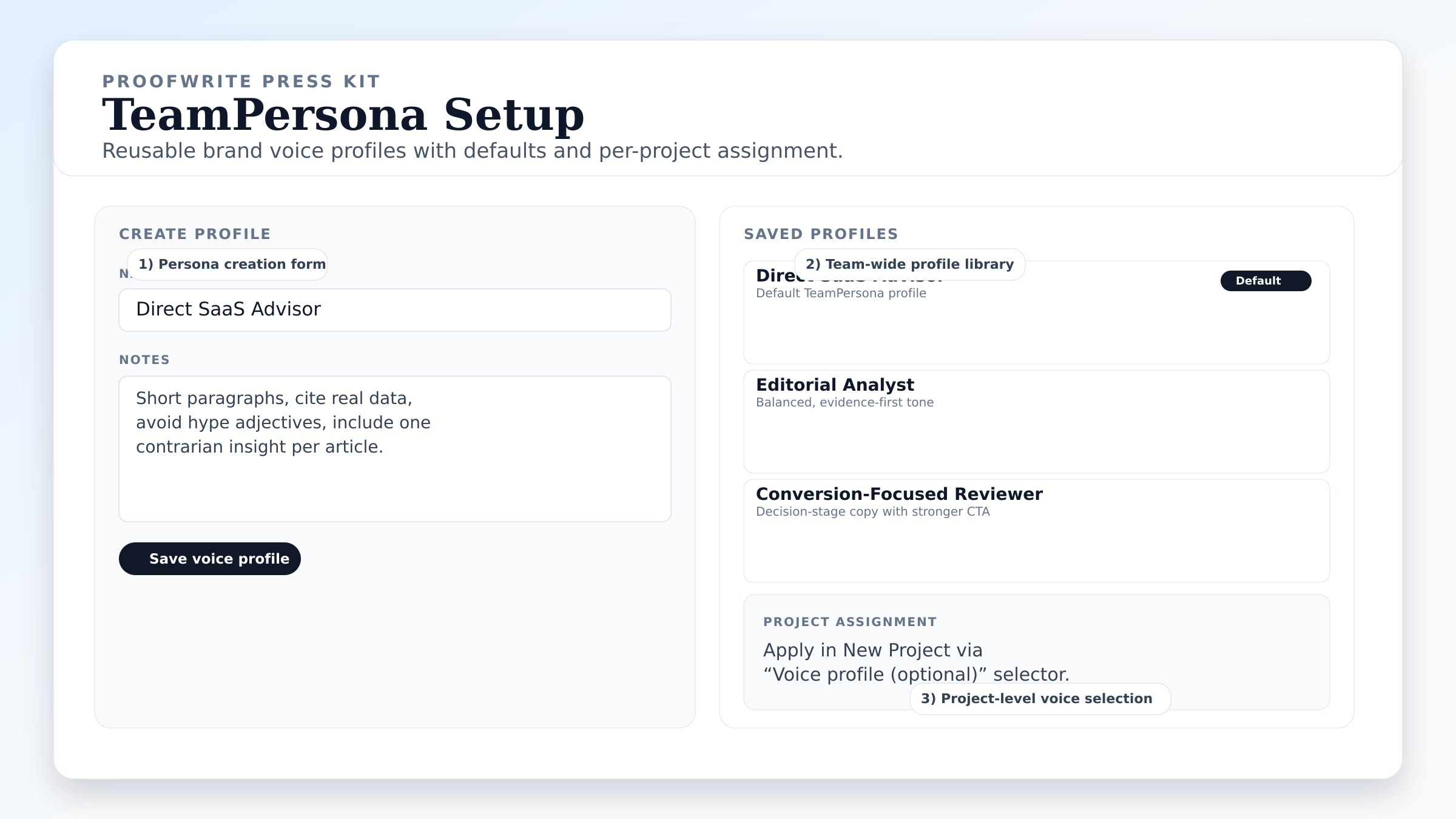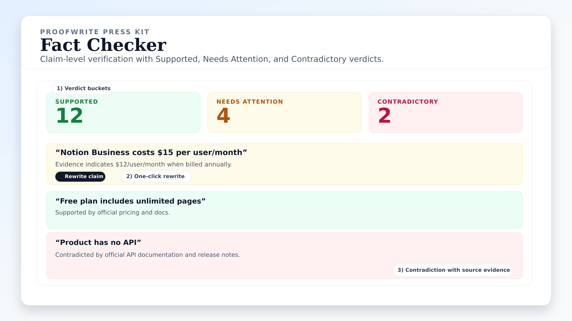 50 wordsProofWrite is an AI writer for factual SEO content production. It supports reviews, listicles, how-to guides, comparisons, freeform articles, and guest posts. Teams get four model options, keyword research, daily suggestions, TeamPersona voice control, dual-model fact-checking, and one-click WordPress publishing for trusted scale across agencies, in-house teams, and solo operators.
